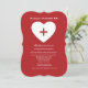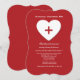 Una audaz invitación roja con un corazón blanco y un corte transversal central. Perfecto para cualquier persona que se gradúe en el campo médico. También es adecuado para la celebración del retiro de un profesional médico. ¿Quieres ahorrar dinero? Imprima esta invitación en el papel de esquina cuadrado básico.