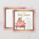 Invitación de baby shower rosa y dorada con una adorable bebé vestida con un tutú rosa y perlas sentada en una hermosa silla rosa y dorada sobre un precioso fondo de encaje rosa y dorado. Esta elegante invitación de baby shower rosa y dorada se personaliza fácilmente para su evento simplemente agregando sus datos en el estilo de fuente que elija. También puede agregar un color de fondo. Este es un diseño impreso sin encaje real, diamantes, oro, purpurina, etc.