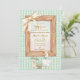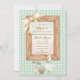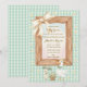 The invitation is framed by a rustic wooden border topped with a large, creamy silk bow, all set against a soft green and white gingham check background dotted with delicate daisy blooms. This "Sweet Little Silly Goose" theme is beautifully finished with elegant teal script and classic gold typography, creating a playful yet sophisticated look for honoring the mom-to-be.