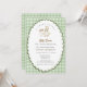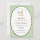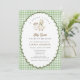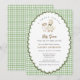 Cute silly goose gender neutral baby shower invitation with sage gingham scalloped border.