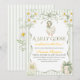 This charming sage green baby shower invite features a vintage-inspired goose wearing a bonnet, delicate daisy florals, soft stripes, and an elegant bow detail. The playful phrase “A Silly Goose is Almost on the Loose” makes it perfect for a gender neutral baby shower celebration.
