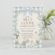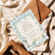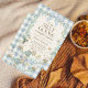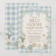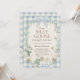 The invitation is framed by a soft blue and white gingham (buffalo check) border and a delicate winter greenery wreath topped with a beautiful light blue bow. This whimsical, "cottagecore" inspired look is ideal for honoring a new little one during the colder months