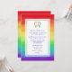 Vibrante y elegante invitación de boda lesbiana en colores arcoiris con símbolos de venus interbloqueados y fuentes púrpura.