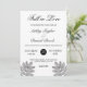 Esta elegante invitación a la boda en blanco y negro es perfecta para un boda de otoño moderno. El diseño sencillo presenta hojas con una tipografía negra elegante sobre un fondo blanco