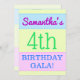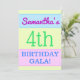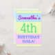 Este colorido diseño de invitación para fiestas de cumpleaños incluye un mensaje como "¡GALA DE CUMPLEAÑOS de Samantha!", donde el nombre y el número de cumpleaños pueden ser personalizados. También cuenta con un fondo colorido, divertido y geométrico. Los detalles del evento en la parte posterior se pueden personalizar. Se podría usar para invitar a la gente a la celebración de cuarto cumpleaños o fiesta de cumpleaños de alguien. [~Z0000311]