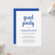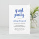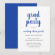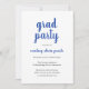Simple invitación a una fiesta de graduación con un diseño clásico con "fiesta de grado" y el nombre del graduado en una espesa escritura azul sobre un fondo blanco. El reverso es azul sólido. Una elegante invitación con un moderno toque minimalista para un graduado chica.