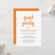 Simple invitación a una fiesta de graduación con un diseño clásico con "fiesta de grado" y el nombre del graduado en una espesa escritura de escritura naranja sobre un fondo blanco. El trasero es un naranja sólido. Una elegante invitación con un moderno toque minimalista para un graduado chica.