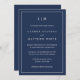 Simple invitación a una boda azul marino con un diseño moderno y elegante con tu monograma de dos letras en la parte superior y tus detalles rodeados de un delgado borde. Las fuentes y los colores de fondo pueden cambiarse a los colores que desee pulsando el botón "personalizar". Una moda y un diseño de diseño, ideal para una pareja minimalista.