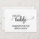 Esta señal de mesa principal de boda con caligrafía negra simple es perfecta para una boda rústica o moderna. El diseño es a doble cara (imprime en ambos lados) y presenta una fuente de escritura de pincel elegante y un corazón femenino encantador. Utilice estas tarjetas para reservar la mesa principal en la recepción de su boda.