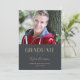 Esta moderna tarjeta de foto para graduación presenta una tipografía simple y una gran foto. Una foto horizontal del graduado está en la parte superior, con la palabra "Graduado" escrita con letras de moda en la capital debajo. Debajo de la tipografía, agregue el nombre del graduado en caligrafía de escritura, con el año escolar y el año de graduación en la parte inferior de la tarjeta. La tipografía es de oro sobre un fondo gris de carbón. La parte posterior de la tarjeta de graduación incluye una plantilla opcional para agregar detalles de la fiesta de graduación.