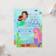 ¡Es una celebración divertida bajo el mar! Únete a nosotros mientras celebramos las aventuras bajo el mar de tu pequeño con esta invitación colorida y festiva. Cuenta con un fondo de océano en la parte delantera y trasera de la invitación. Dos adorables sirenas, una morena y otra con cabello rosa, y sus amigos marinos, peces y cangrejos, también adornan la invitación. ¡Será un cumpleaños Mer-tástico! Esta invitación también tiene una adorable impresión en la parte posterior de la misma sirena con cabello rosa.