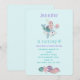 Invitación de cumpleaños con un ilustracion adorable. Diseñado con un chica de sirena de bonito montando un delfín feliz. Un pequeño amigo de medusas los acompaña. Decorada con pequeñas manchas de purpurina de oro falso. Las conchas marinas y las estrellas de mar en el fondo.