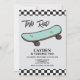 Invitación al segundo cumpleaños de Two Rad con cheque negro y skateboard azul.