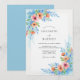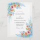 A vibrant watercolor design bursts with lively floral elements in shades of coral, pink, and peach. Delicate blue-green foliage weaves through the blooms, creating a romantic and cheerful ambiance. This design evokes a sense of joy and natural beauty for a special occasion.