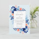 A soft sky blue background sets a tranquil stage for this vibrant watercolor design. Deep navy blue anemones and delicate peach blossoms create a striking contrast, complemented by an array of azure petals and airy green leaves. The botanical arrangement evokes a fresh seaside atmosphere, making it ideal for a romantic coastal or spring event.