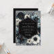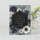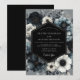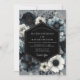 A rich tapestry of deep blues, greys, and whites evokes a dramatic, nocturnal mood. Lush, dark floral elements, possibly anemones and roses, are interspersed with delicate foliage, creating an opulent and romantic atmosphere.