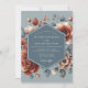 An elegant and romantic design featuring a painterly arrangement of beautiful blooms. Lush, full-petaled roses in shades of terracotta and rust create a warm contrast against a sophisticated slate blue backdrop. Muted greenery and delicate buds complete this artistic and moody botanical composition for your nuptials.
