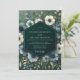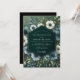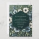 A dramatic and elegant design showcasing a lush botanical arrangement. Painterly anemones in shades of dusty slate blue and soft ivory bloom against a dark, moody backdrop. Rich emerald green foliage adds depth, creating a sophisticated and romantic atmosphere for your special day.