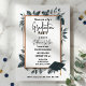 Celebrate the graduate's big achievement with this elegant and modern graduation party invitation. The design features a sophisticated border of watercolor leaves in shades of slate and dusty blue, intertwined with a chic faux gold geometric frame. A classic graduation cap (mortarboard) with a gold tassel accents the corner, adding a traditional touch to the contemporary botanical theme.