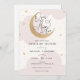 Invitación de Baby Shower que incluye nubes y estrellas color rosa de agua con luna purpurinoso dorada y guión divertido "Sobre la luna por dos!" Personalice su información o haga clic en "hacer clic en el personalizar más adelante" para ajustar el tipo de letra, el tamaño y el color.
