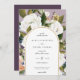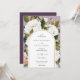 Elegante aceite de inspiración vintage sobre canvas florales botánicas, invitación a la boda. Marco de arco con acento dorado, fondo violeta claro y respaldo de color morado oscuro. La invitación presenta un diseño de tipografía de moda que combina caligrafía y negrita.