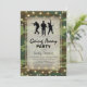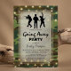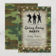 Invitaciones de fiesta militar personalizadas para celebrar a un soldado que se va al servicio nacional, o para celebrar su regreso a casa. Con un fondo de camuflaje, una pieza central superpuesta vintage, tropas de marina, luces de cuerda y una plantilla de fiesta moderna.