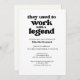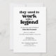 Despídete con estilo con esta divertida y sentida invitación a la jubilación. El frente presenta la cita audaz "Solían trabajar con una leyenda" junto con el nombre del jubilado y los detalles del fiesta —porque los compañeros de trabajo también merecen algo de reconocimiento. En la parte trasera, espacio para compartir una memoria de las leyendas invitadas. Pueden escribir una memoria y llevarla al fiesta. Hacerlo un conservador personalizado que realmente apreciarán. Es una perfecta despedida de los jubilados a aquellos que hicieron que los días de trabajo fueran más agradables (o al menos más soportables). Muchas gracias por tu interés - ¡no te olvides de darle un poco como si esto te hiciera sonreír! ¡Ahorra papel, tiempo y dinero! Solicitar una descarga digital