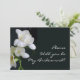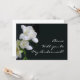Una tarjeta de solicitud de dama de honor con freesias blancas en un fondo negro con letras blancas. La letra es totalmente personalizable y el reverso de la tarjeta se deja en blanco para que añada su mensaje y detalles.