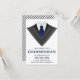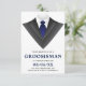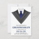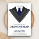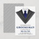 Invite a sus padrinos con esta tarjeta de solicitud moderna que presenta un traje clásico con corbata azul sobre un fondo blanco. Simplemente agregue los detalles de su evento en esta plantilla fácil de usar para hacer que sea una invitación única. Voltee la tarjeta para revelar un patrón de rayas negras y blancas en la parte posterior de la tarjeta.