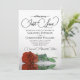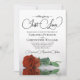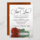 Esta romántica invitación a la boda se caracteriza por un único rosa de color rojizo, de tallo largo y color naranja, que se encuentra en un estanque de agua. El encabezamiento está escrito en elegantes letras y dice: Nothing Fancy, Just love. El hotel cuenta con un ramo de rosas con un arco de satén blanco y un espacio para los detalles de los bodas, incluido un código QR donde sus huéspedes pueden obtener más información y/o RSVP online. Esta invitación es una maravillosa combinación de lo moderno y lo atemporal, una manera perfecta de invitar a tus amigos y familias a compartir tu alegría en tu día especial.