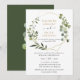 Esta elegante e personalizable invitación de boda cuenta con un marco geométrico dorado adornado con hermoso follaje de acuarela verde y se ha combinado con una caligrafía caprichosa y una fuente serif de clase en dorado y gris. Para realizar cambios avanzados, seleccione la opción "Haga clic para personalizar más" en Personalizar esta plantilla.