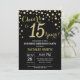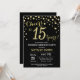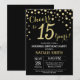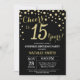 Sorpresa 15 cumpleaños invitación con fondo de diamante negro y Purpurina de oro. Confetti de oro.Cumpleaños de niños. Cumpleaños de niño o Chica.