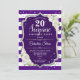 Sorpresa Invitación a los 20 Años. Diseño púrpura, blanco y falso purpurina de plata. Presenta rayas, rosas blancas, fuente de guión y confeti. Perfecto para una elegante fiesta de cumpleaños. Se puede personalizar para mostrar cualquier edad. Mándame un mensaje si necesitas más personalización.