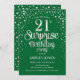 Sorpresa 21ª Invitación de fiesta de cumpleaños. Elegante diseño en verde esmeralda forestal y falsa plata purpurina. Presenta un diseño elegante de tipo de letra y letra de guión. Mándame un mensaje si necesitas edad personalizado.