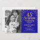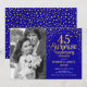 Invitación de sorpresa de aniversario de bodas 45 con foto. Diseño elegante en azul zafiro con fuente de escritura en oro falso y confeti. Envíame un mensaje si necesitas un año personalizado.