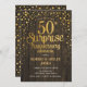 Invitación de Sorpresa 50 Aniversario de Boda. Diseño rústico elegante con patrón de madera marrón oscuro, fuente de escritura en falso oro y confeti. Envíame un mensaje si necesitas un año personalizado.