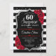 Sorpresa Invitación a los 60 Años. Diseño rojo, blanco y negro femenino con una falsa plata purpurina. Presenta rayas negras y blancas, rosas rojas, fuente de escritura y confeti. Perfecto para una elegante fiesta de cumpleaños. Se puede personalizar para mostrar cualquier edad. Mándame un mensaje si necesitas más personalización.