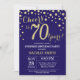 Sorpresa 70 cumpleaños Invitación con fondo de diamante Purpurina azul y oro de la Marina. confetti de efecto metalizado dorado. Cumpleaños de adultos. Cumpleaños de hombres o mujeres. Para una mayor personalización, haga clic en el botón "Personalizar" y utilice nuestra herramienta de diseño para modificar esta plantilla.