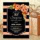 Purpurinas negros y coralinos a rayas florales sorpresa invitación a la fiesta de cumpleaños número 80.