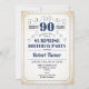 Sorpresa 90 cumpleaños invitación para hombres y mujeres. Elegante diseño retro en blanco azul marino con un fondo cremoso vintage. Muestra el tipo de letra elegante del guión tipográfico. ¡Saludos a 90 años! Se puede personalizar en cualquier edad. Perfecto para una celebración de cumpleaños adultos.