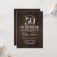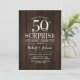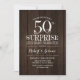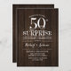 Invitación de Celebración de Sorpresa de Aniversario de Bodas 50. Diseño rústico elegante con patrón de madera marrón oscuro. Cuenta con fuente de escritura blanca elegante. Envíame un mensaje si necesitas personalización adicional.