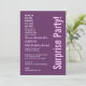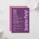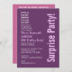 Este moderno diseño en color morado magenta y rosa es una manera elegante de invitar a sus huéspedes a una fiesta de cumpleaños de personalizado SURPRISE. Todo el texto es totalmente personalizable. Puede cambiar el color de fondo o el de texto para un aspecto diferente. Aunque este diseño aparece en un papel básico, recomiendo el papel de acabado de lino, que le da a su invitación un toque más elegante, o el papel metálico de color hielo premium, que le dará a sus invitaciones un brillo festivo.