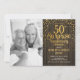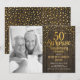 Invitación de bodas de 50 aniversario con sorpresa rústica y foto. Diseño elegante con patrón de madera rústica y dorado brillante falso. Cuenta con fuente de tipografía script y confeti. Perfecto para una celebración de cincuenta aniversario dorado con estilo. Personaliza con tus propios detalles. Envíame un mensaje si necesitas un año personalizado. Impresiones de invitaciones de Zazzle o plantilla digital para imprimir instantáneamente.