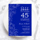 Invitación de celebración de aniversario de bodas de sorpresa floral de zafiro blanco 20 años. El diseño minimalista moderno azul real presenta acentos botánicos y fuente de escritura tipográfica. Tarjeta de invitación floral simple perfecta para una fiesta de aniversario sorpresa con estilo. Se puede personalizar para cualquier año de matrimonio. Impresiones de invitaciones de Zazzle o plantilla digital imprimible de descarga instantánea.