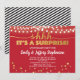 Elegante invitación de fiesta sorpresa dorada con diseño de luces de cuerda en fondo rojo. Diseño clásico.