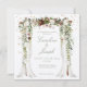 Una brillante invitación a una boda dorada con dosel floral con una acuarela pintada con un dosel de color burdeos y floral y colgante vegetación de eucalipto y drenaje de tela blanca con tus nombres en un elegante tipo de letra de guión.