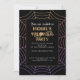 Personaliza la invitación de la víspera de Hallow con el patrón de halloween de la telaraña naranja púrpura sobre negro. Con texto blanco personalizado.