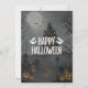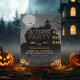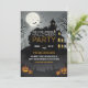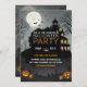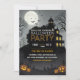 Prepara el ambiente espeluznante perfecto con este oscuro diseño de invitación a casa. Negros profundos, amarillos y naranjas brillantes, silueta de mansión embrujada, cielo iluminado por la luna con murciélagos. Ideal para los animadores de la fiesta de Halloween, los vestuarios y los espeluznantes eventos nocturnos. Invitación digital/impresa para adultos o familias que anhelan una elegancia escalofriante.