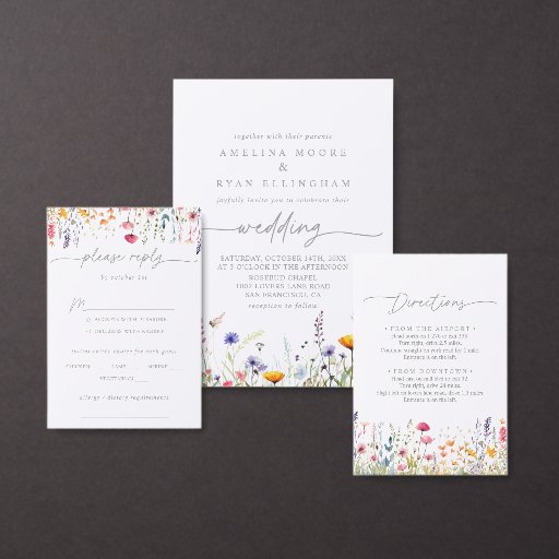 This spring colorful wildflower wedding breakfast invitation is perfect for a modern event. The design features an elegant calligraphy script, which reads wedding in muted gray, hand-painted watercolor purple, violet, burgundy, red, pink, blush, yellow wildflowers, green leaves assembled into a seamless floral patterns.