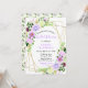 This fun and whimsical bridal shower invitation features watercolor purple flowers and foliage on a gold geometric frame. The text combines handwritten script and serif fonts for a stylish and modern look. This is perfect for a spring or summer rustic bridal shower.